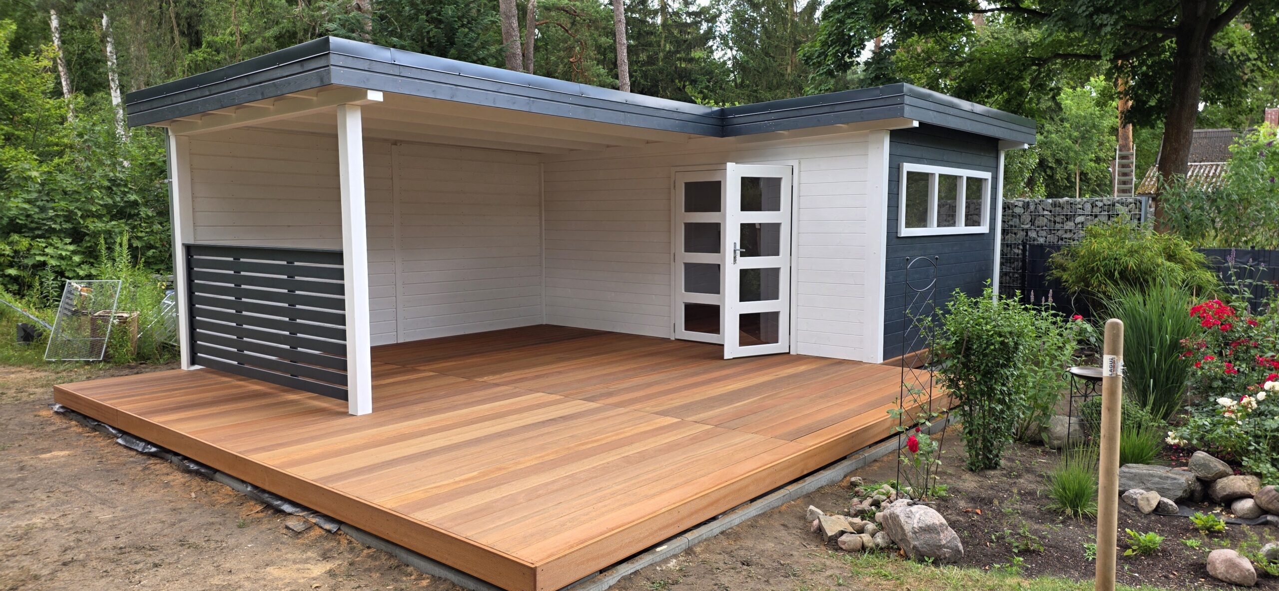 Besonderheiten: - Integrierte, überdachte Terrasse mit großzügiger Nutzfläche - Seitlicher Sichtschutz aus horizontalen Lamellen - Abgetrennter Innenraum mit Tür und Fenster - Modernes, kubisches Design - Harmonische Einbindung in den Gartenbereich